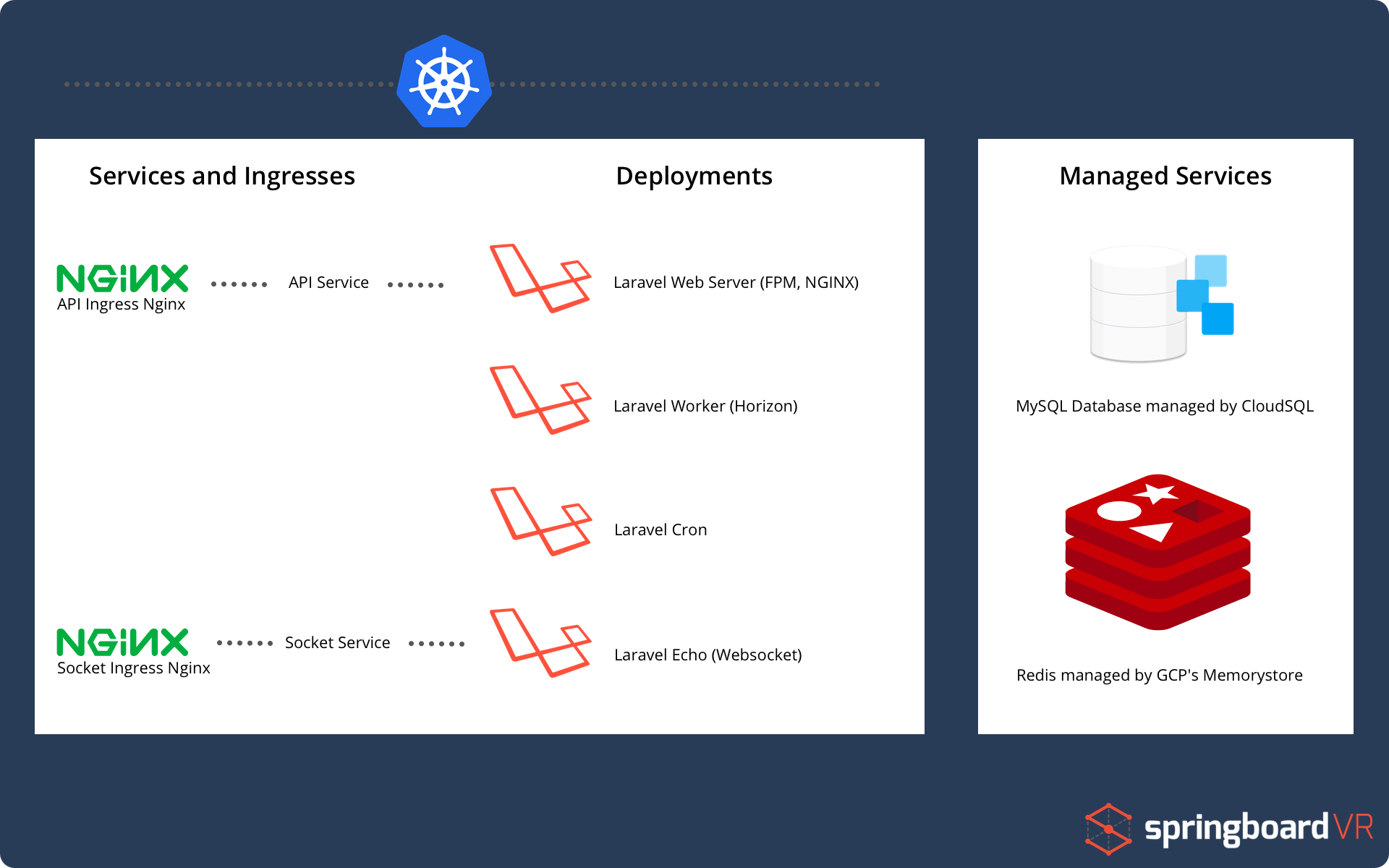 Here at SpringboardVR we’ve recently finished a migration of our cluster from being managed by Kops, hosted on AWS to running on Google Kubernetes Engine. I won’t go into detail why we moved our cluster, but the important thing to take away is that we treated our new cluster as a new start when it came to running our Laravel application in a more Cloud Native way. With this new cluster we leveraged everything we’ve learned over the past year running a production Laravel app in Kubernetes to help us set up a system that maximizes performance. First, though let’s go over what our application looks like.