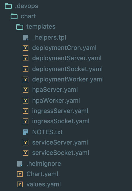 What our Helm chart looks like in the folder structure To keep things nice and organized, we keep a .devops folder version controlled in the root of the Laravel app, this keeps all of our devops configuration (including the Helm chart) right next to the application code. It’s editable, and visible by the whole team. With a system like this a deployment is just a single helm install .devops/chart from reality.